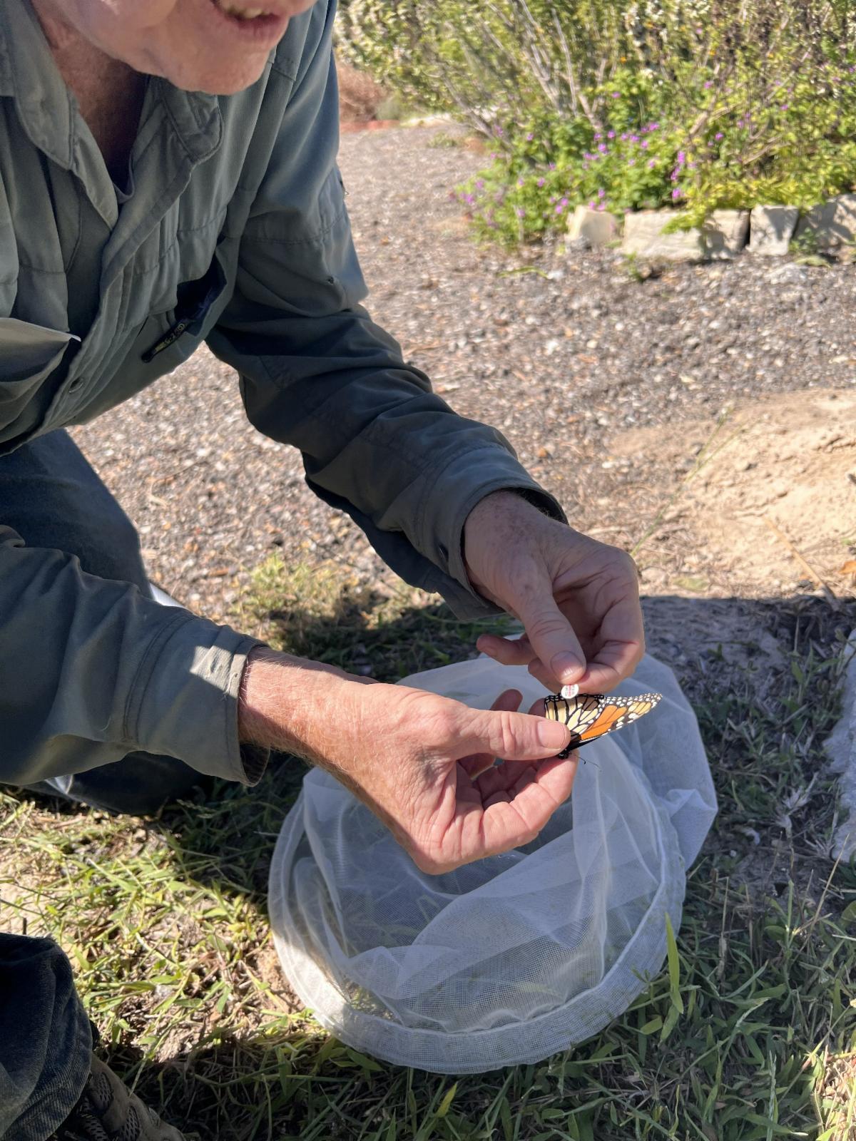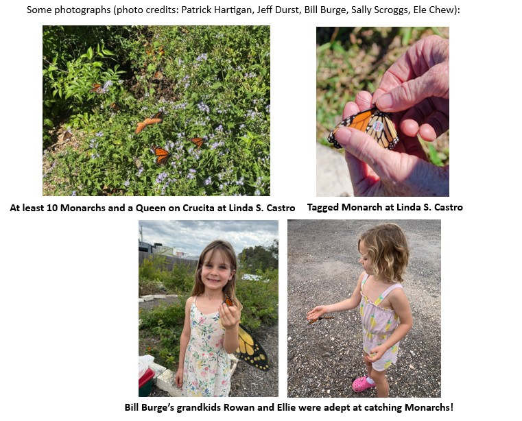 In addition to tallying and reporting the number of Monarchs sighted, tagging was being conducted. I led the tagging program at Linda S. Castro, while Park Ranger Sara Rock led it at Big Tree. In addition, chapter member and experienced Monarch tagger Kimberly Draper joined us. The programs attracted a good turnout of the public and chapter members, spanning multiple generations of participants. Several people displayed exceptional butterfly-catching skills, e.g., Greg Simmons and Bill Burge’s grandchildren, and Ray Kirkwood was no slouch! Our combined effort resulted in over 70 Monarchs being tagged (as of November 3). Interestingly, 70% of the Monarchs I tagged were males. The tagging data will be submitted to the Monarch Watch organization, providing important “Citizen Science” information for tracking Monarch population movements and dynamics.
