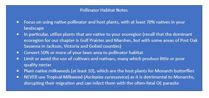 The Monarchs we were observing are part of the eastern population, Danaus plexippus, and are likely to have emerged from eggs laid in the northeast United States or southeast Canada. They are en route to wintering grounds in Mexico, an epic journey that can be as long as 3000 miles. By the time they reach the Rockport area, they still have >500 miles to go! To complete this migration, they must have nectar plants to feed on along the way. Thrilling as it was to see so many Monarchs, we should not forget that this is a species in trouble, and good pollinator habitat is at a premium. Sites such as Linda S. Castro are magnets for attracting Monarchs and other pollinators, but are scattered islands of habitat surrounded by a sea of roads, buildings, houses, lawns, ornamental landscapes that produce little nectar, invasive plants, overgrazed pastures, and other degraded habitats. To say that there is a great need for more pollinator habitat would be an understatement. Our chapter has many pollinator projects underway, so it is doing its part in helping the “Bring Back the Monarchs!” campaign, but more is needed. I encourage everyone to incorporate pollinator plants into their landscape and to promote pollinator habitats to their friends, local parks, and businesses.
