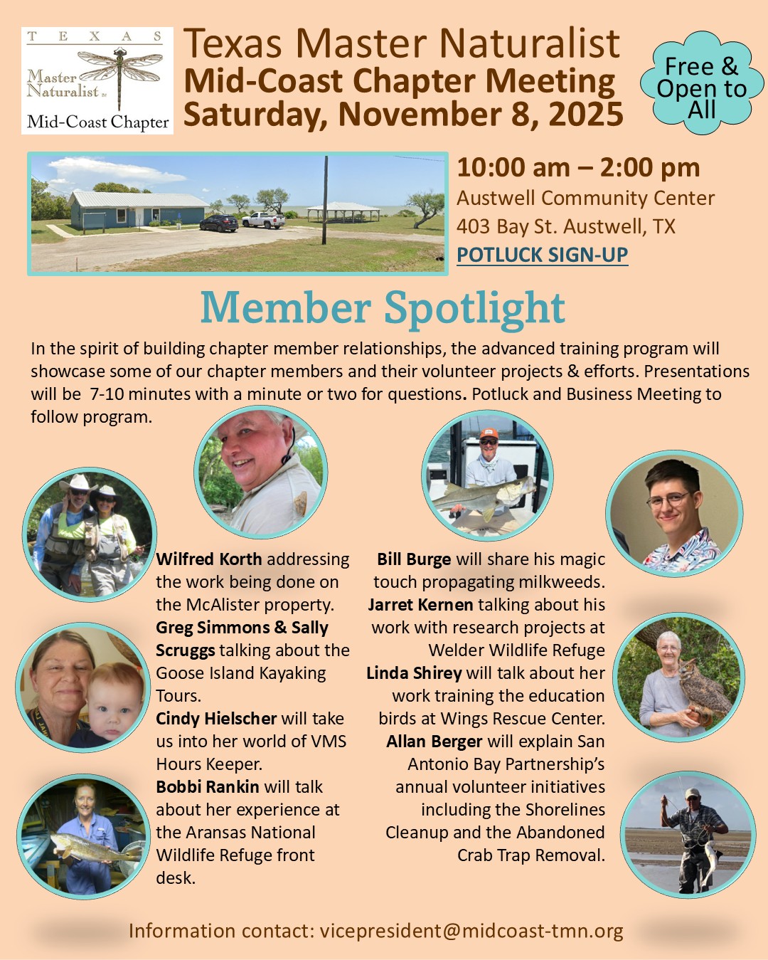 For more information about the Mid-Coast Chapter of Texas Master Naturalists or to get involved, please visit www.midcoast-tmn.org