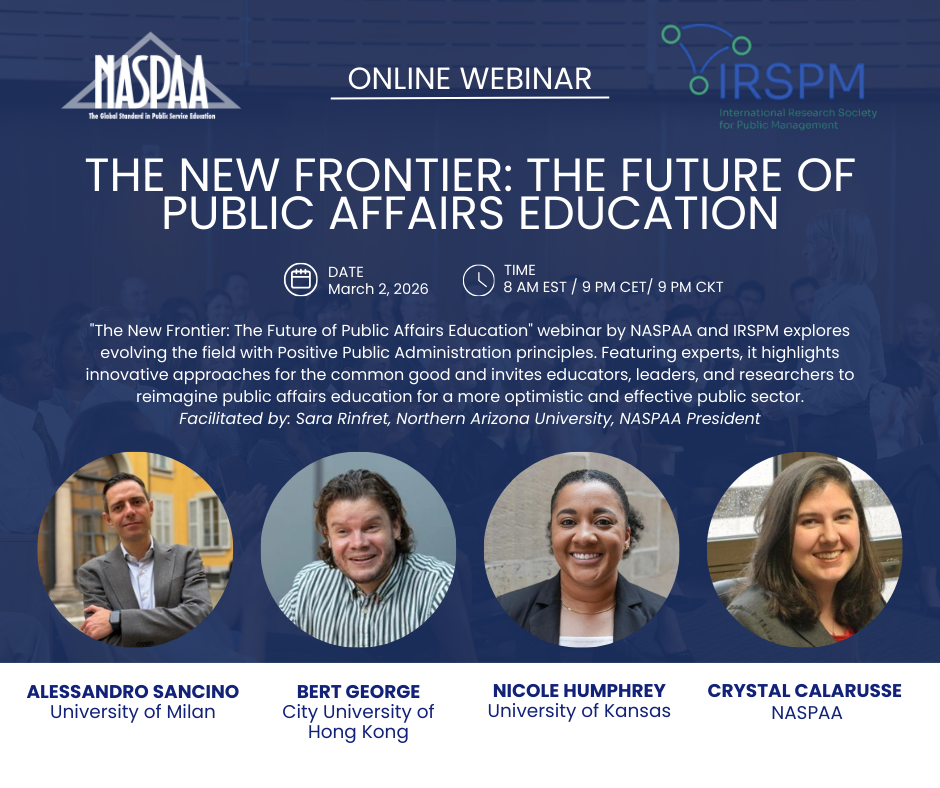 The New Frontier: The Future of Public Affairs Education webinar, hosted by NASPAA and IRSPM, explores how the field can evolve through the principles of Positive Public Administration. Featuring leading experts, the session highlights innovative approaches that emphasize the common good. This global conversation invites educators, public service leaders, partners, and researchers to reimagine public affairs education for a more optimistic, resilient, and effective public sector.
