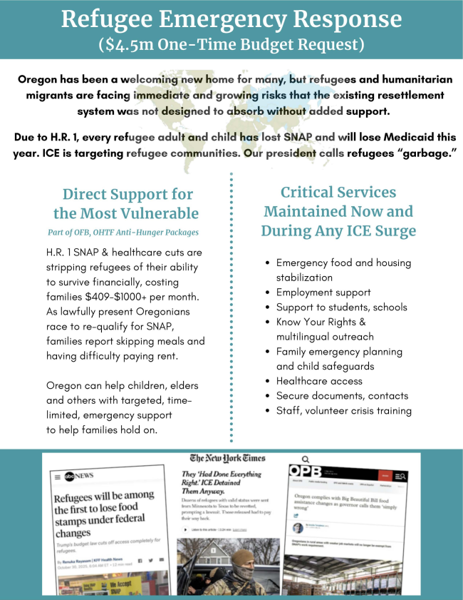 Oregon has been a welcoming new home for many, but refugees and humanitarian migrants are facing immediate and growing risks that the existing resettlement system was not designed to absorb without added support. Due to H.R. 1, every refugee adult and child has lost SNAP and will lose Medicaid this year. ICE is targeting refugee communities. Our president calls refugees "garbage."