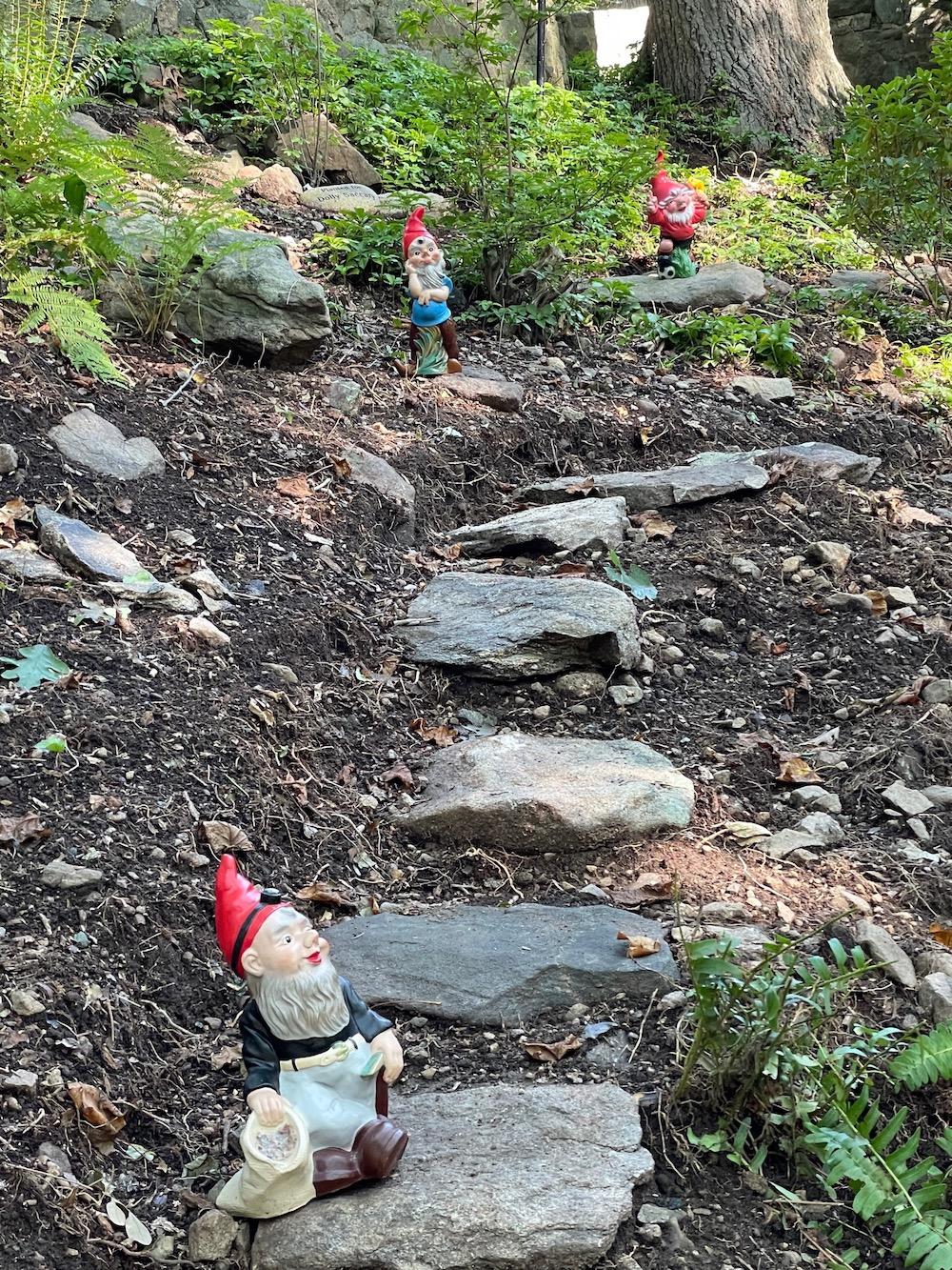 The Gnome Stepping Stone Walk is located above Olive's Way and below the viewing patio. The gnomes, who appear and disappear because they are very shy, are working on signs now.