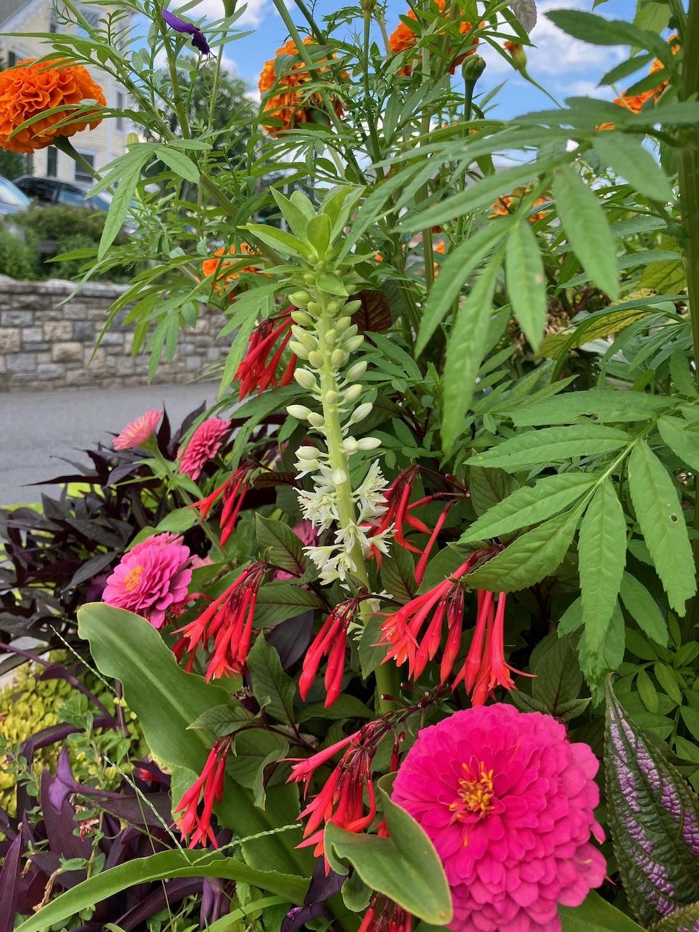 At left: A pineapple lily blooms in the town hall planters, designed by Rob Carpenter and Kathy Lapolla.