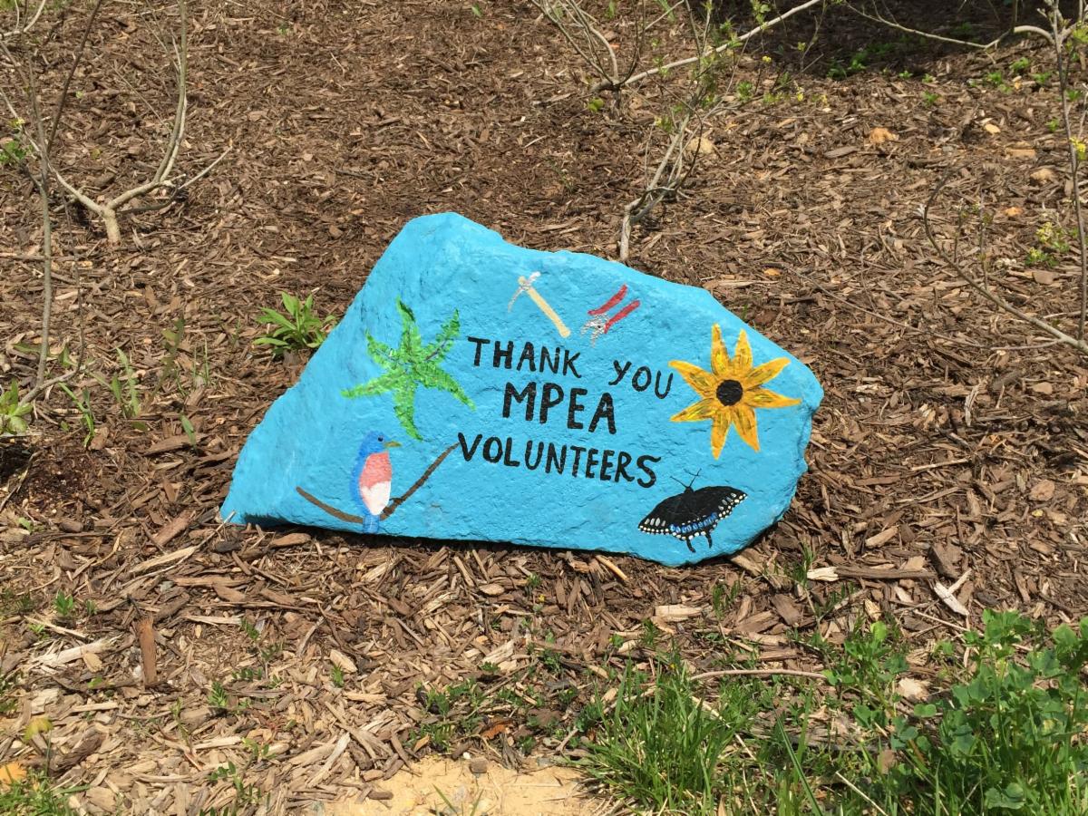 This month the county also celebrated National Volunteer Week (April 18-24) with the “Volunteers Rock!” Campaign by encouraging the creation of art rocks to honor volunteers. Accordingly, a dedicated and creative volunteer created a specially decorated rock just for the MPEA. We have decided to display the colorful creation here, at the MPEA, instead of with the other painted rocks at the community center rock gardens. The art rock was just too nice to let it go elsewhere.