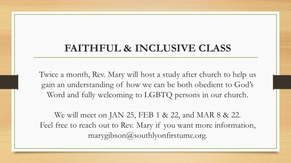 Twice a month, Rev. Mary will host a study after the 11AM service to help us gain an understanding of how we can be both obedient to God’s Word and fully welcoming to LGBTQ persons in our church.