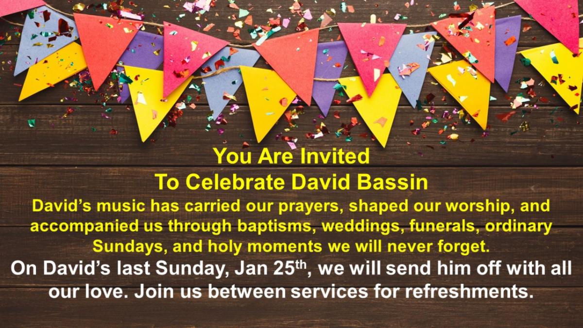 | | From SPRT: We plan to celebrate David Bassin on his last Sunday with us on January 25, 2026. If you have ever been a member of the choir or bell choir during his tenure, we would love to have you join us that day to help us send David off with all the love after his 21.5 years of service as the Director of Music Ministries at our church. We will have our regular Sunday morning schedule that day with services at 8:30 and 11am. | | |