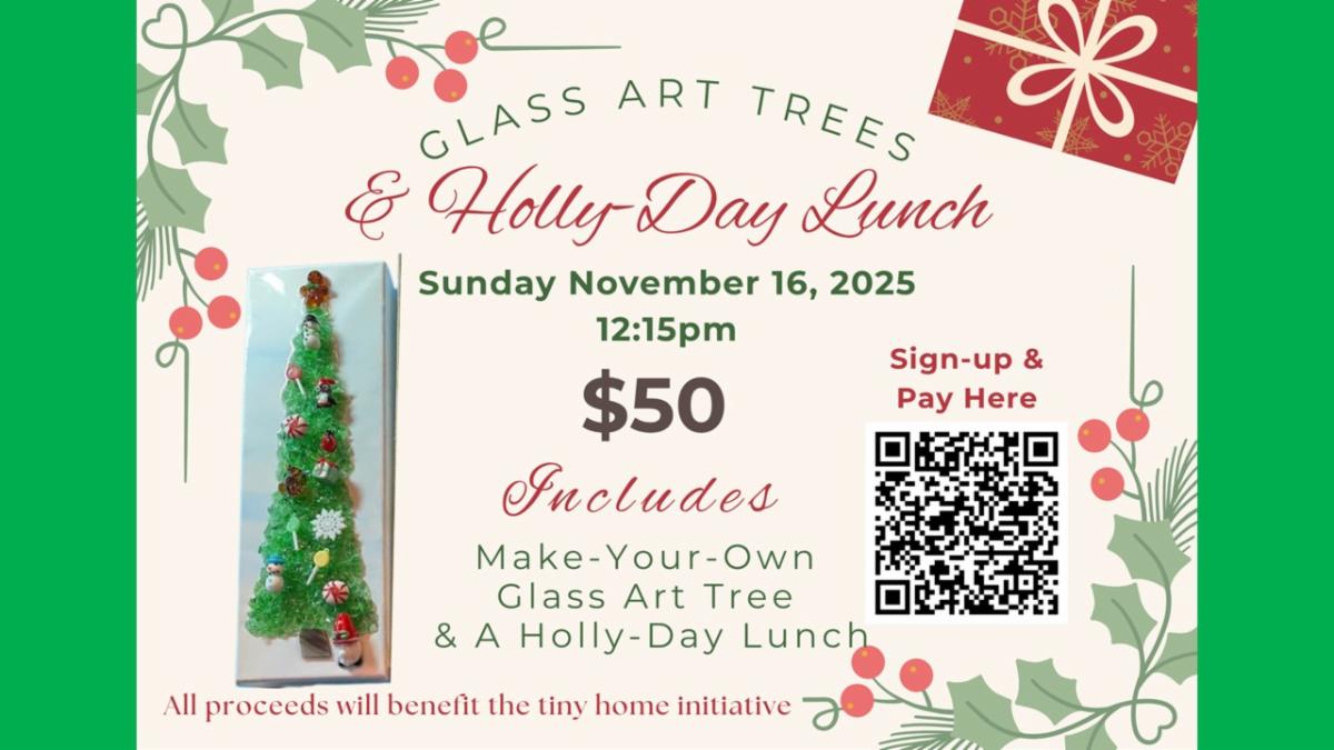 Bobby Bushey and the Tiny Home Initiative Team are hosting a glass art and holly-day lunch in support of the Tiny Home Initiative. Sign up today using the QR Code or the link below: $50 includes all of the materials needed for your make-your-own glass art and a special holly-day lunch on Nov 16th at 12:15 in the Fellowship Hall.