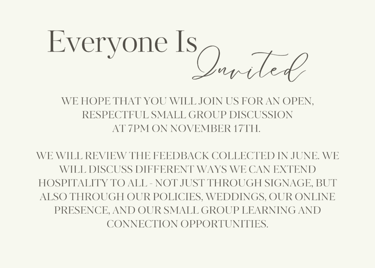 Using small breakout groups, we will discuss different ways we can extend hospitality to all - not just through signage, but also through our policies, weddings, our online presence, and our small group learning and connection opportunities.