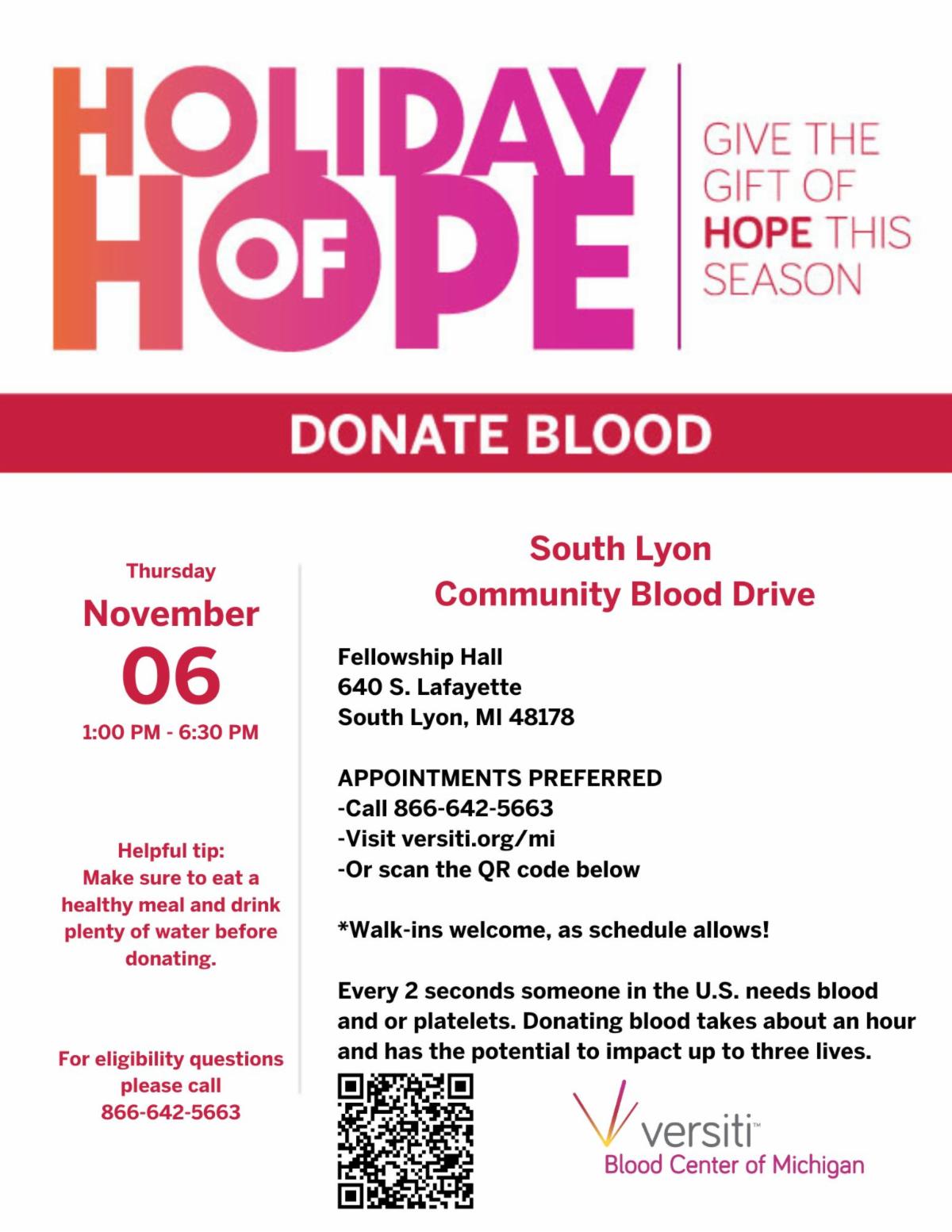 SOUTH LYON COMMUNITY BLOOD DRIVE NOV 6