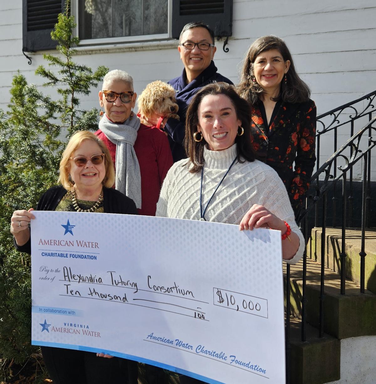 ATC's Board Chair Anna Davis, Board Vice Chair Linda Thoms, Percy Paik and Director Woody Paik, and Executive Director Lisa Jacobs accept a check from Virginia American Water's External Affairs Manager, Marybeth Leongini (front right, in white).