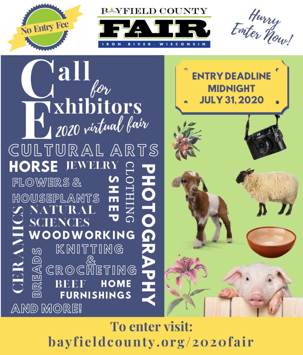 The Bayfield County Fair has retooled and has started taking entries online. Wisconsin residents can enter up to twelve items accompanied by a photo and/or video that will be judged and awarded premiums.