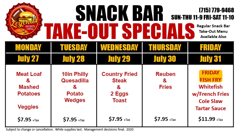 The Snack Bar will continue to offer take-out service, and the Outdoor Patio Bar along with the Gift Shop will be open with altered hours.