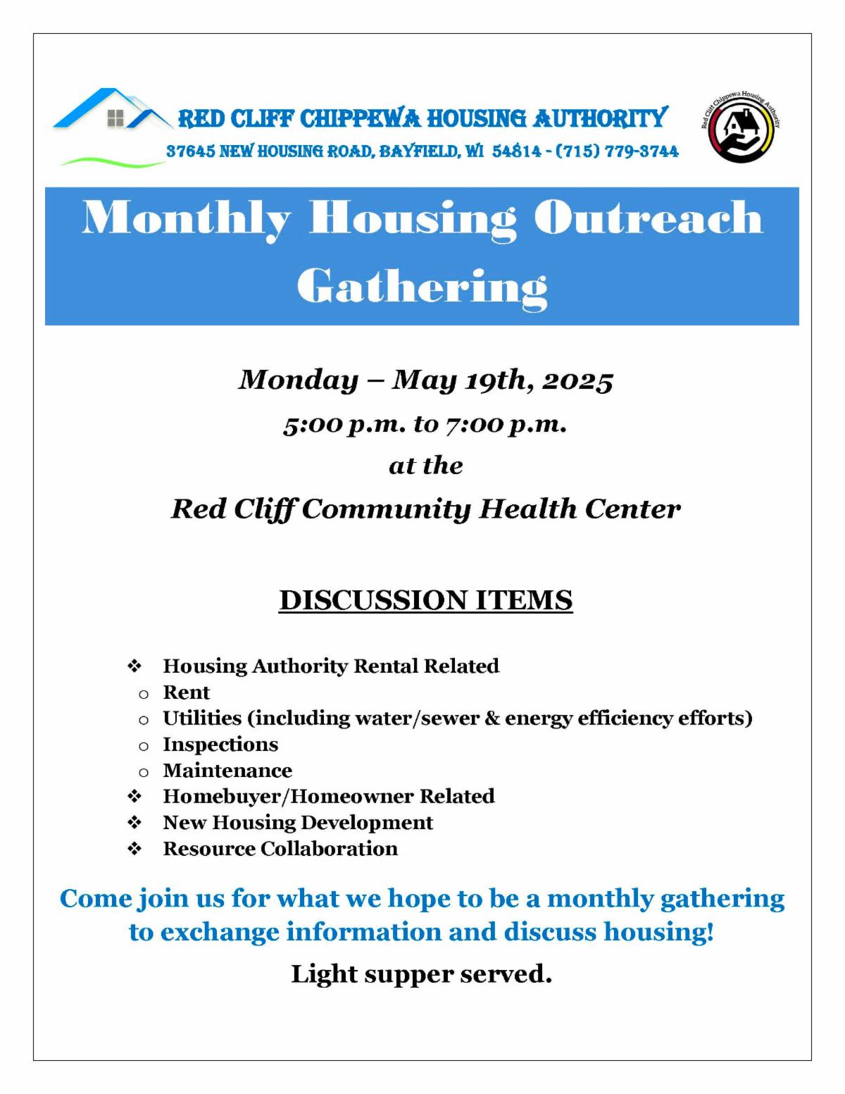 Please join us from 11:30 AM to 1:30 PM at the Red Cliff ICW office on the following Wednesdays: