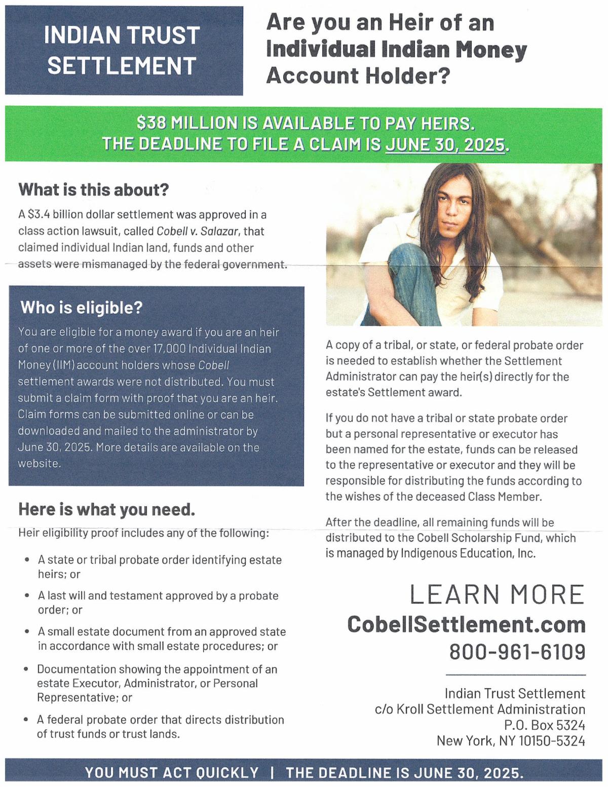 The group will be performing work June 15 through June 21. Work orders should be returned to the Tribal Administration Building front desk at 88455 Pike Road by Monday June 9, 2025.