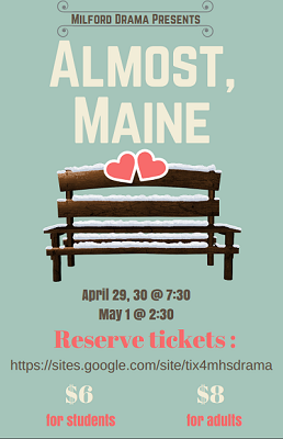 Don't miss Milford High School Drama Department's last show of the school year--Almost, Maine. Tickets can be purchased at the door.