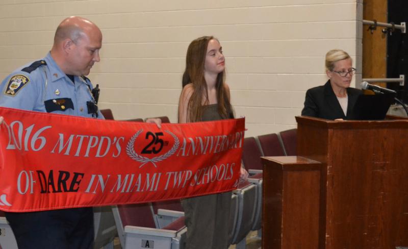 s been 25 years of offering DARE to our students. Miami Township Police Chief, Sue Madsen, and Sergeant, Kevin Petrocelli, presented a banner to the Board of Education at its June meeting commemorating the 25th year of the DARE program in Milford Schools.