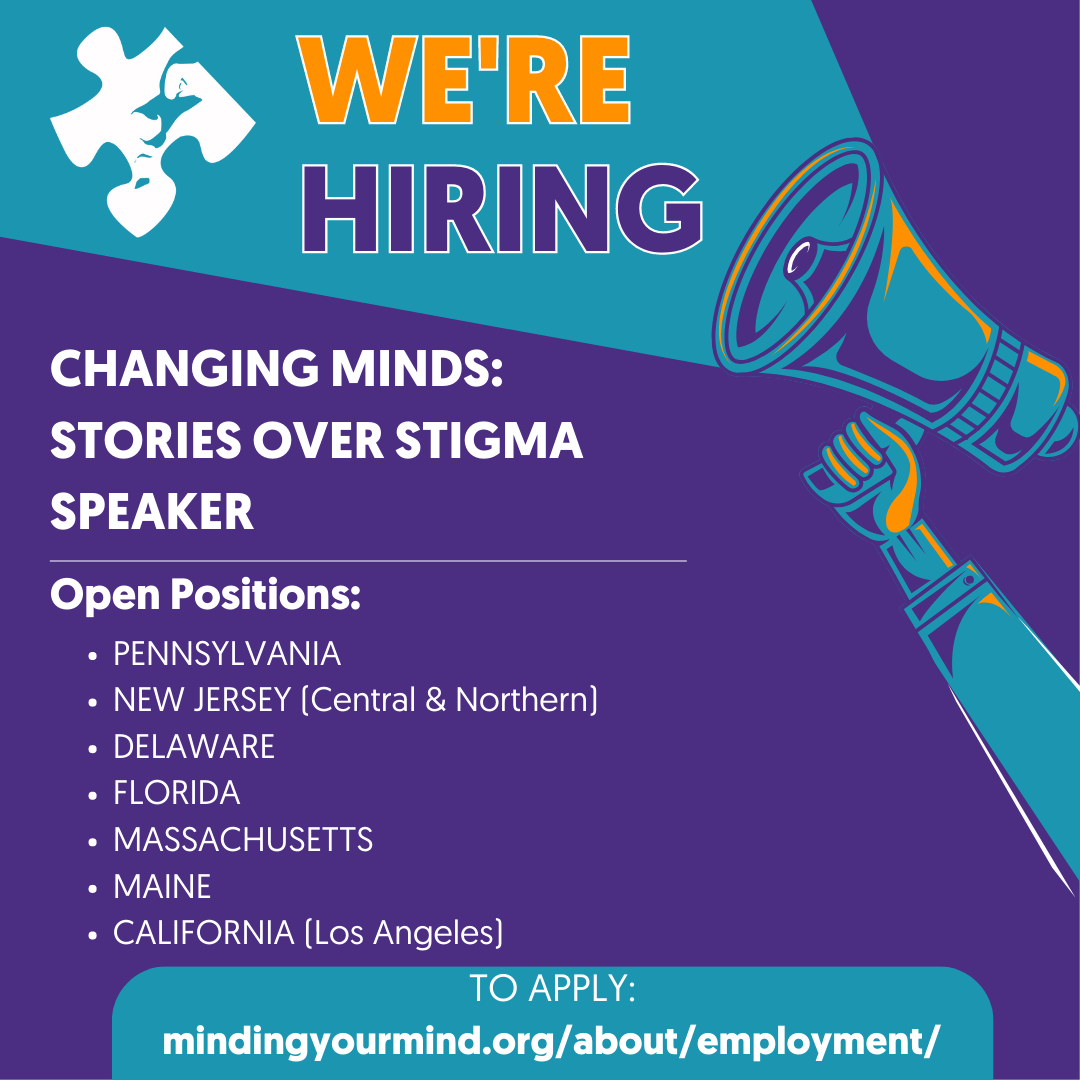 As demand for mental health education increases, so do requests for our presentations. To meet this need, Minding Your Mind is hiring speakers for the Changing Minds: Stories Over Stigma program. We are seeking college students or young professionals in PA, NJ, DE, FL, MA, ME, CA, who are interested in meaningful advocacy in the mental health field If you are a young adult who has come through a mental health crisis, are in a productive recovery process, and are interested in sharing your story to inspire others, please contact us. Ability to present during school hours and travel is preferred. Read more