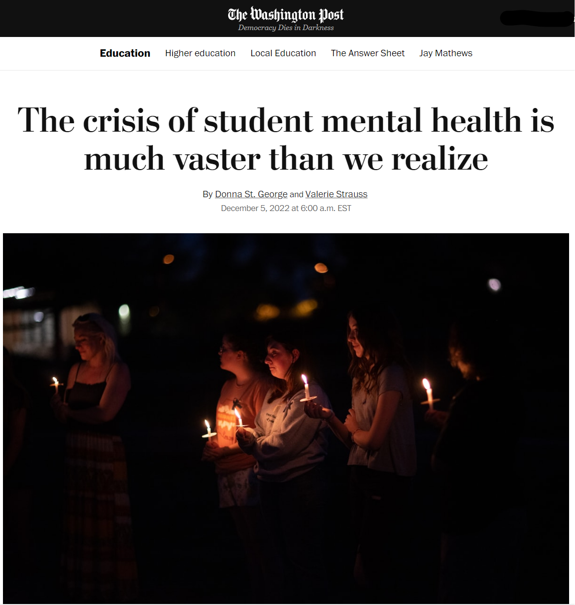 "Not long after the pandemic started, researchers began to document declines in child and adolescent mental health...Hospital emergency room visits spiked for suspected suicide attempts among girls ages 12 to 17, according to the Centers for Disease Control and Prevention. From February to March 2021, the number jumped by 51 percent compared with the same period during 2019. For boys, the increase was 4 percent. Early research from MIT suggested the suicide rate for people aged 10 to 19 increased in 2020, compared with before the pandemic. In other research, the CDC found nearly 45 percent of high school students were so persistently sad or hopeless in 2021 they were unable to engage in regular activities. Almost 1 in 5 seriously considered suicide...A substantially larger percentage of gay, lesbian, bisexual, other and questioning students reported a suicide attempt." Read the full article