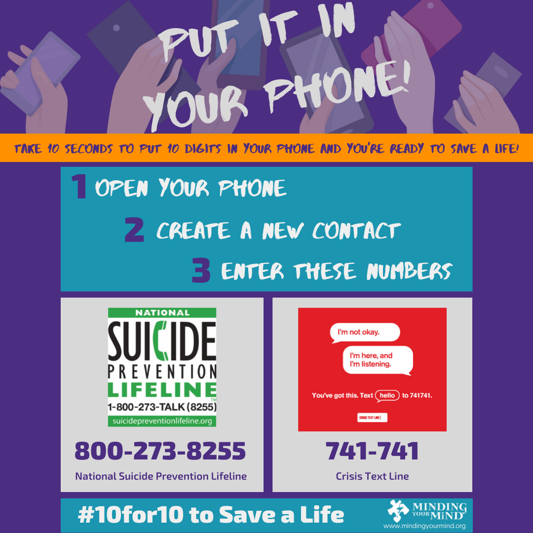 Put It In Your Phone! #10for10 to Save a Life highlights how easy it is to add the numbers for the National Suicide Prevention Lifeline and the Crisis Text Line to a cell phone: it takes 10 seconds to add 10 digits in your phone to be ready to save a life. Both services are staffed by trained volunteers and professionals with someone available 24 hours a day. Follow our social media accounts to participate, LIKE, and SHARE our posts. Tag us @mindingyourmind and use #10for10 — and put it in your phone!