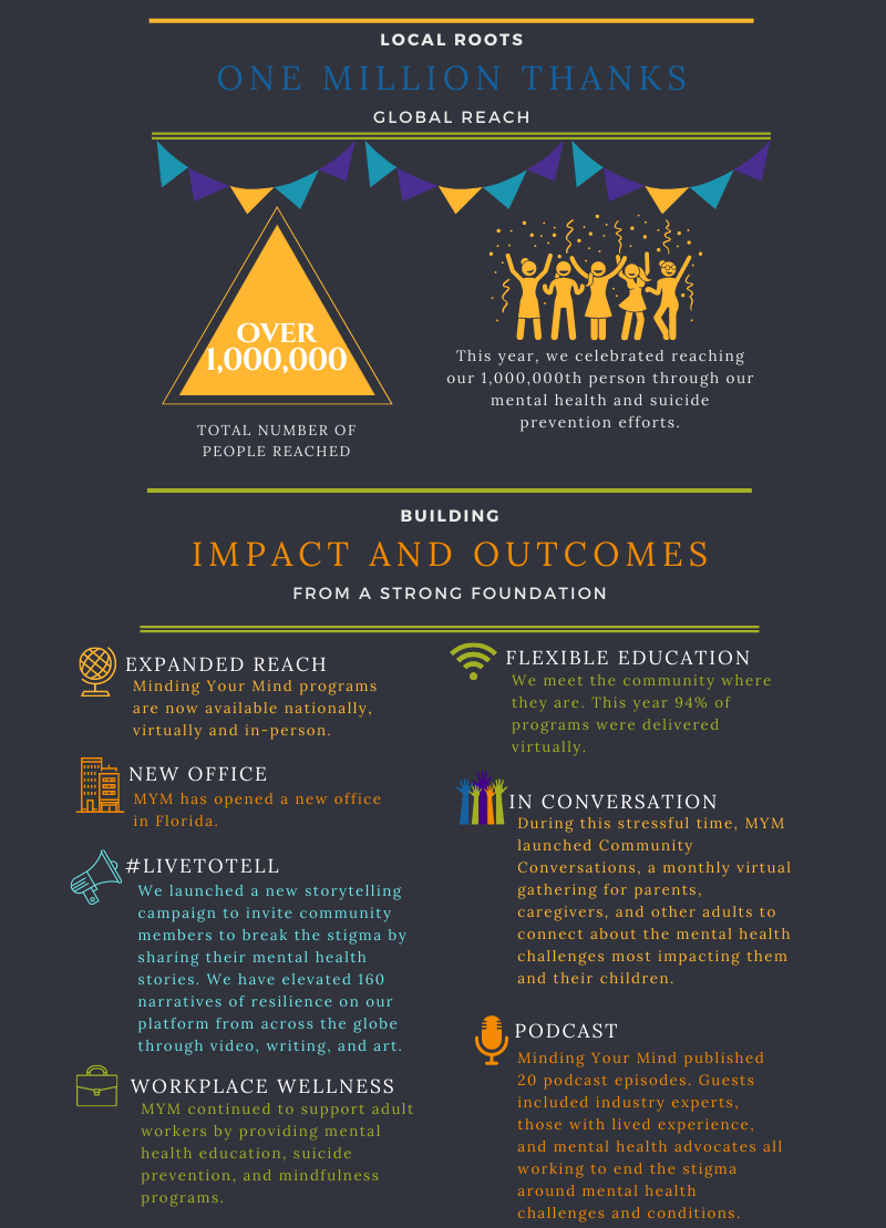 The change of season from summer to fall brings us back to the familiar structured routine that comes with school days. Routines can help decrease stress and anxiety, and help us cope with our everyday lives. As we begin another new school year, I hope that scheduling or attending a Minding Your Mind presentation has by now become part of your routine. We are so excited to return to in-person programming and look forward to seeing you somewhere other than on a computer or laptop screen. If you prefer, we can still see you there as we now provide both in-person and virtual programming. You have our promise that we will continue to provide effective, timely, and impactful mental health education programs in all of our communities by whatever delivery system works best for you. Please reach out and schedule early because we anticipate another very dynamic and busy year. We want to hear from you regarding issues and concerns that are directly affecting your communities — you can email me directly with thoughts and ideas. As always, our goal is to spark meaningful conversations that provide support and education to students and all of the adults in their lives. We are here to help!