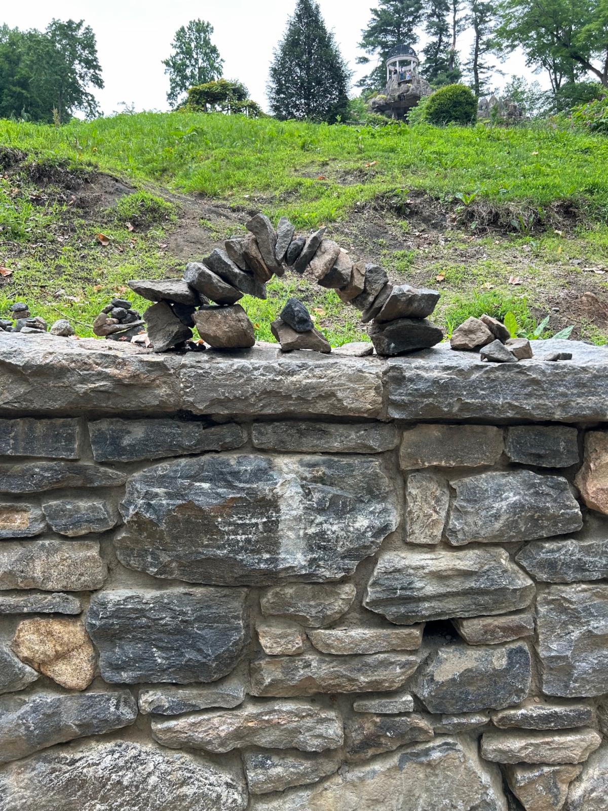 | July 7, 2025   Dear Friends of Untermyer Gardens,   Serendipity is a wonderful quality in a garden. Imagine our delight when we spied this miniature stone arch (crafted, no doubt, by miniature hands) on the retaining wall below the Temple of Love. Perhaps it was the work of an aspiring young architect. |