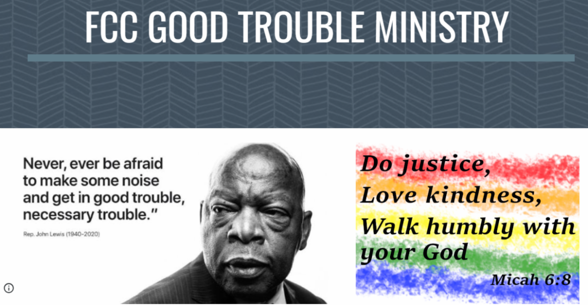 Our first Good Trouble Ministry meeting on Tuesday, October 21 will focus on the upcoming election and ways we can ensure that those who are qualified to vote get the opportunity to vote. Stay tuned for meeting details. In the meantime, visit our website for resources, inspirational sermons and meditations, and updated Good Trouble opportunities. Please join our mailing list for periodic emails.