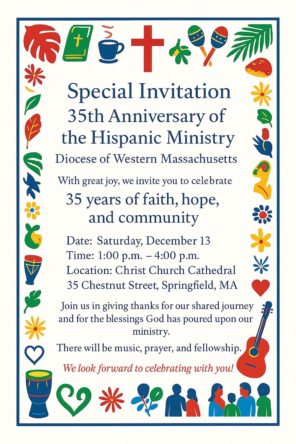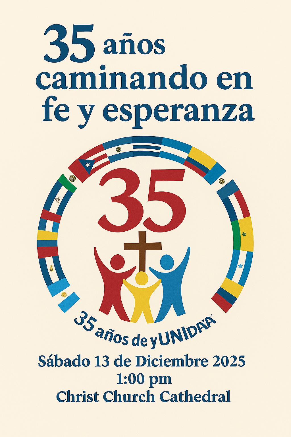 "With great hoy, we invite you to celebrate 35 years of faith, hope, and community. Join us in giving thanks for our shared journey and for the blessings God has poured upon our ministry. There will be music, prayer, and fellowship."