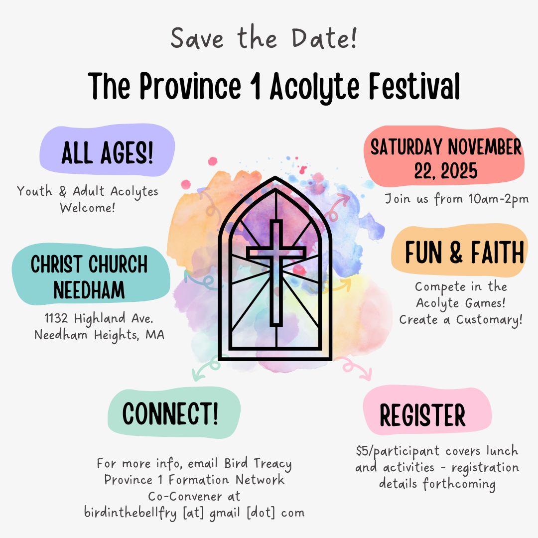 The Province 1 Acolyte Festival will be held at Christ Episcopal Church in Needham, MA on Saturday November 22, 2025 from 10am to 2pm.