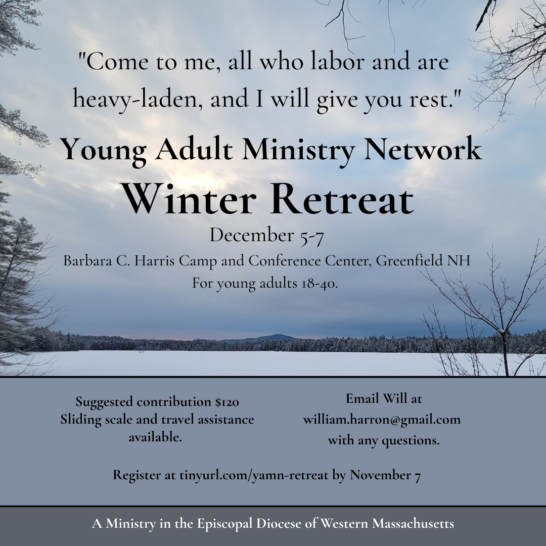 "The Young Adult Ministry Network in the Episcopal Diocese of Western Massachusetts is excited to invite young adults 18-40 to join us for our fifth annual retreat weekend at the Barbara C. Harris Camp and Conference Center in Greenfield, NH, from December 5-7 2025.
