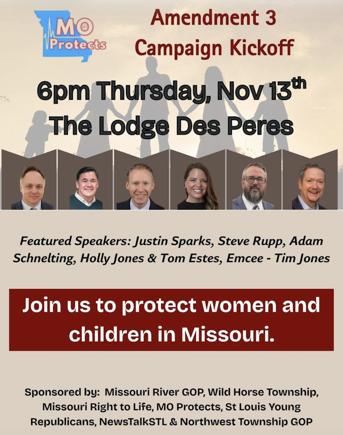 November 13 - Des Peres - Amendment 3 Campaign Kickoff, co-sponsored by Missouri Right to Life. Starting at 6:00 PM at the Des Peres Lodge, 1050 Des Peres Road. Featured Speakers: Justin Sparks, MRL President Steve Rupp, Adam Schnelting, Holly Jones & Tom Estes; Emcee - Tim Jones. Click here to register.