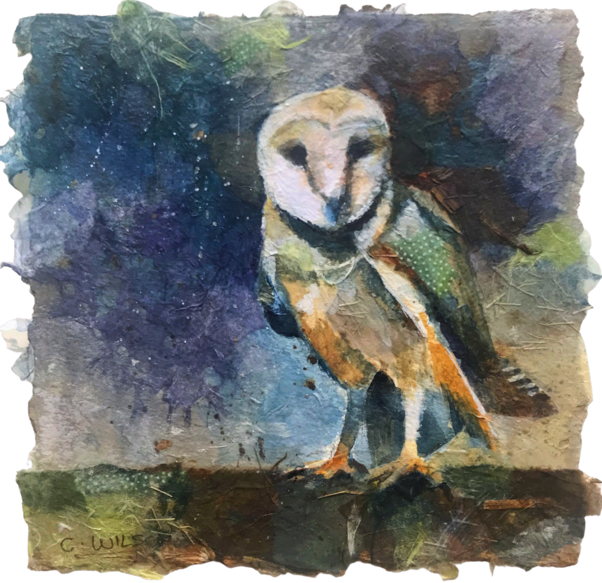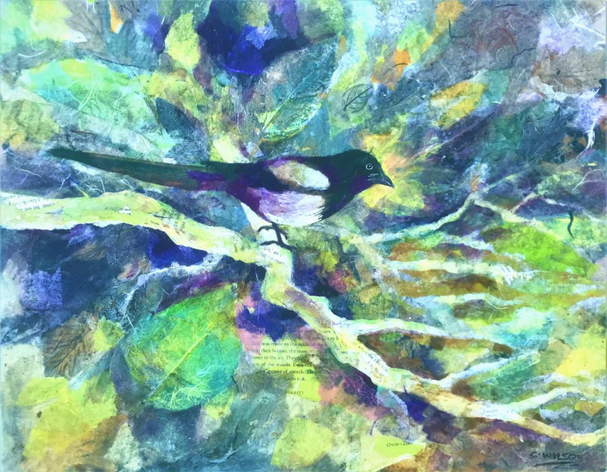 A lover of textures, Wilson specializes in creating collage that has a rich tactile surface, built up by gluing multiple thin layers of rice and tissue paper to create complex surfaces. Partially visible under-layers often include maps and printed words, that add to the story and create a sense of mystery and history.