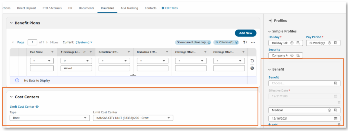 We are rolling out a new look for the Insurance tab in Payroll 2.0 to provide more information in one place when entering insurance offers and accept/declines for ACA. A copy of both the Benefit profile (offer) and the Cost Center are now located on the Insurance tab (accept/decline entry). Both items are still on the Basic tab as well. This should reduce the number of clicks and provide easier verification of correct data entry.
