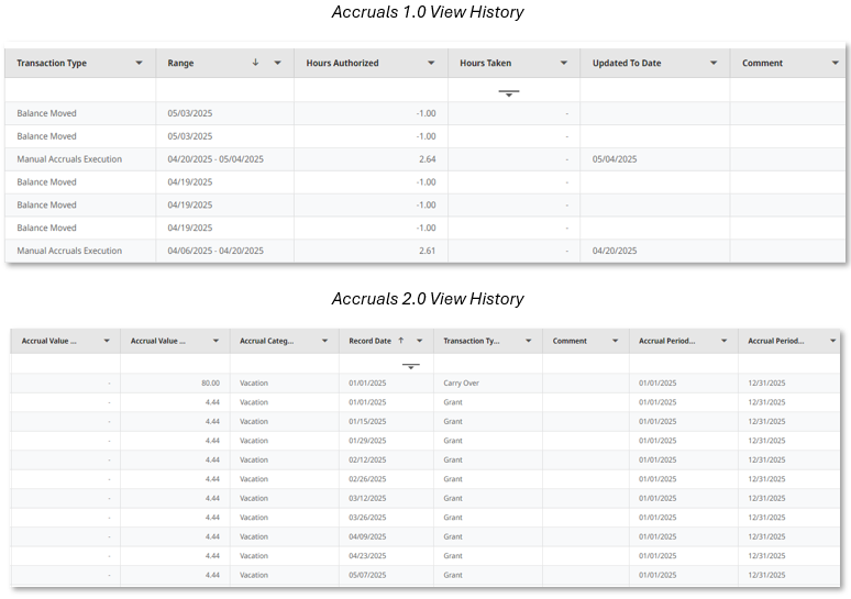The view history on the employee pto/accruals tab is better defined to include grants and carry over amounts. For mandated paid sick leave, there is no longer a need for two “buckets” and all accruals will be shown in one history report.