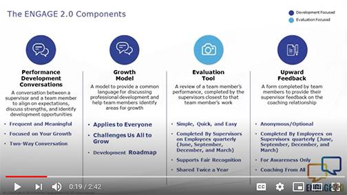 ENGAGE 2.0 is a part of our current performance development process to continue our culture of professional development, coaching and growth. Supervisors complete quarterly evaluations on employees and employees provide upward feedback on supervisors. June 1 will start the next evaluation period - Q2 2021, which will end on June 30.