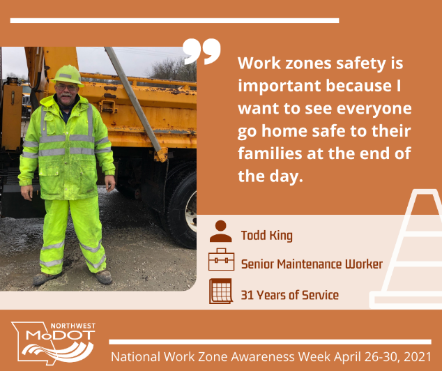 The Northwest District asked these employees to be the public face of Work Zone Awareness Week on the district's social media platforms. Each day during the week, an employee will be featured along with their answer to the question: why is work zone safety important to you?
