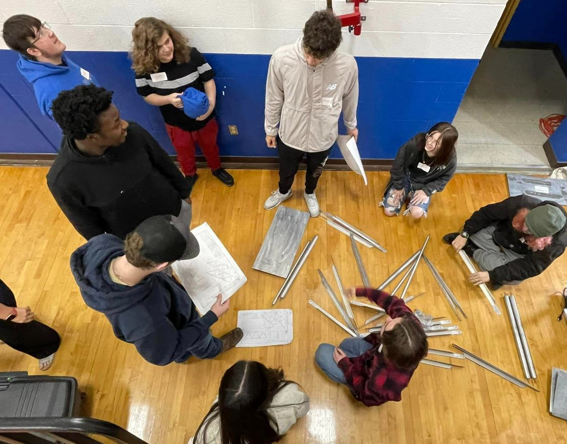 | | Jobs for America’s Graduates students discuss bridge construction during the bridge-building competition at North County High School. Click the image above to view more photos. | This spring, the Southeast District will speak with nearly 500 students from 14 area high schools. The Southeast District currently employees five former JAG students. While those employees did not participate in MoDOT presentations as students, the district hopes to educate today’s students about careers with the department. | |