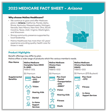 The 2023 collection of state-by-state broker sheetsis now available on the Molina Agent Center. These 18 profiles serve as reference materials for our brokers on each state's Medicare plans, providing: