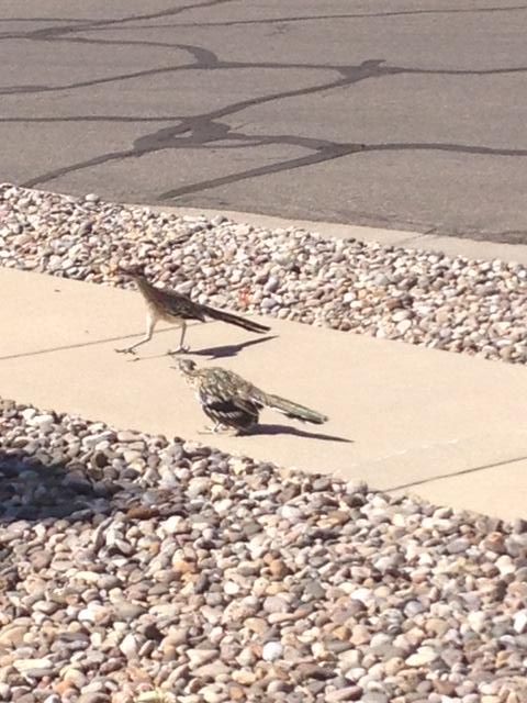 Each morning I enjoy watching this pair of neighborhood roadrunners. A third roadrunner is off camera.