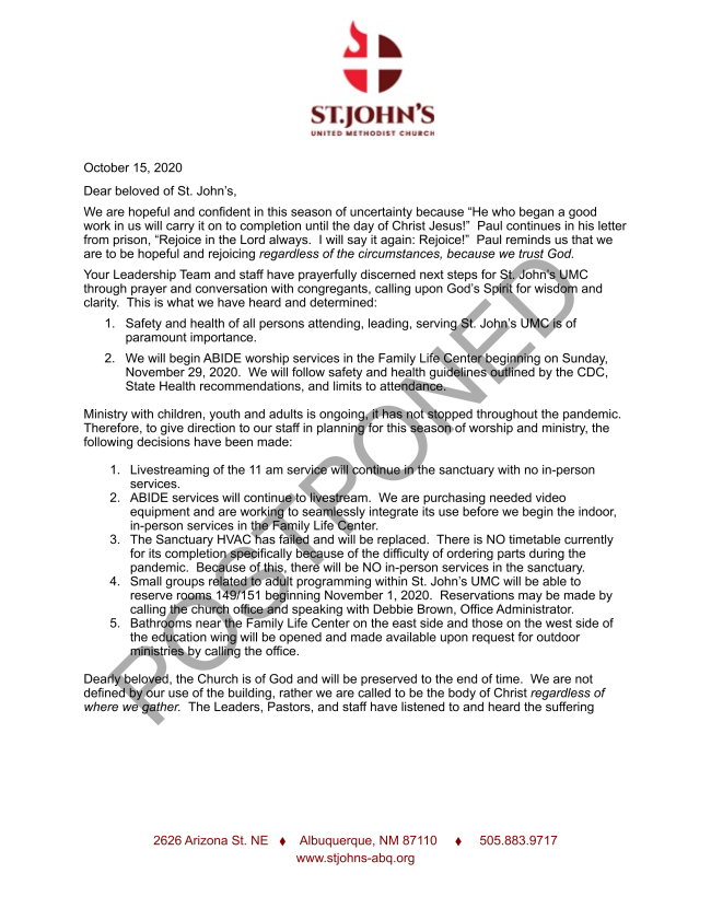 A message from the Leadership Team and the Pastors of St. John’s: