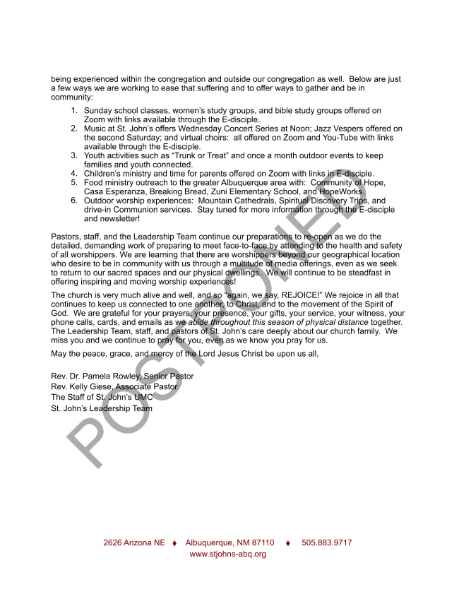 Office Administrator, Debbie Brown, will be answering the phone at St. John’s every weekday from 9:00 am-2:00 pm. Please call the office if you have any concerns or pastoral care needs. Debbie will get messages to Pastor Pam and Pastor Kelly. The office number is 505-883-9717.