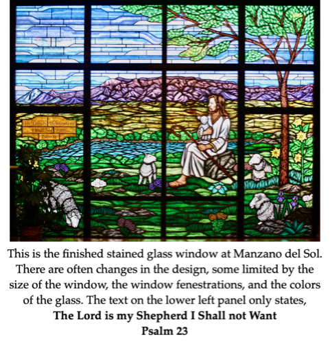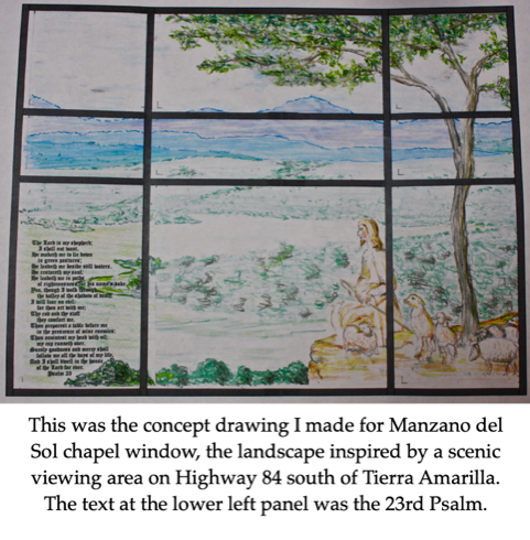 Concerning the stained glass windows for the Trinity United Methodist Church project, I must clarify my part in the creative process. As I mentioned before, I am a Professional Interior Designer and in the case of stained glass windows, I provided the concept, which included the creative design, the colored drawings, and any text and/or memorial notes. These are then usually approved by a “committee” (after all we are a Methodist Church). Then the concept(s) are turned over to the craftsman that work up the design up in stained glass after taking detailed measurements of the planned space. I, myself, do not do the stained glass work. This process is better shown in the following project which was done for the chapel at Monzano del Sol Retirement facility here in Albuquerque. Manzano del Sol is part of the Evangelical Lutheran Good Samaritan Society. Both Trinity and St. John’s UMC’s have had in the past and still do have some members living at this facility. In fact, the St. John’s Joy Singers have given a number of concerts there these past few years. The 3rd photo below was taken in December 2014 and gives one an idea of the size of this project and is showing Joy Singers seated in front of said window.