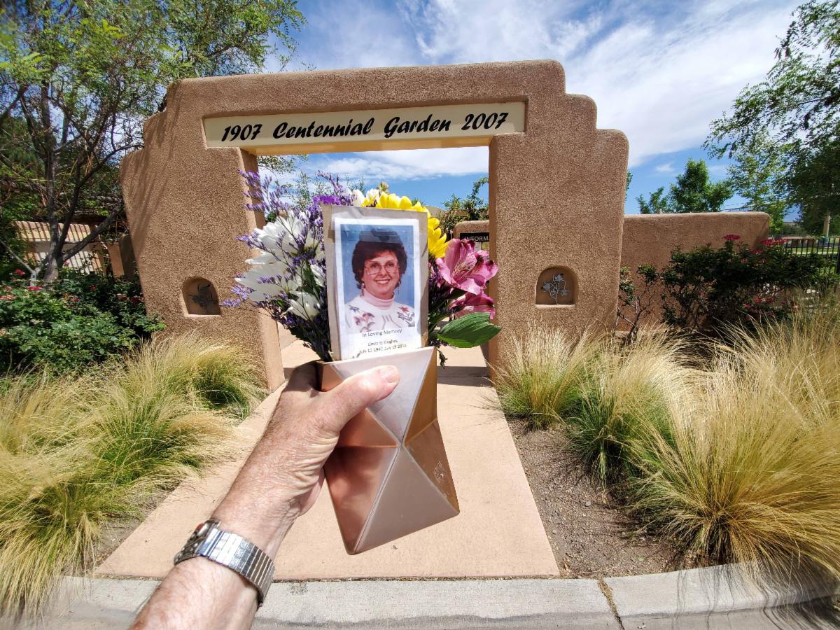 On the one-year anniversary of the passing of Linda B. Hughes, I brought a bouquet of colorful flowers to the Centennial Gardens of Sunset Memorial Cemetery in loving memory of my wife and our 60 years of being together, doing good in New Mexico and all the places we have lived enjoying life.
