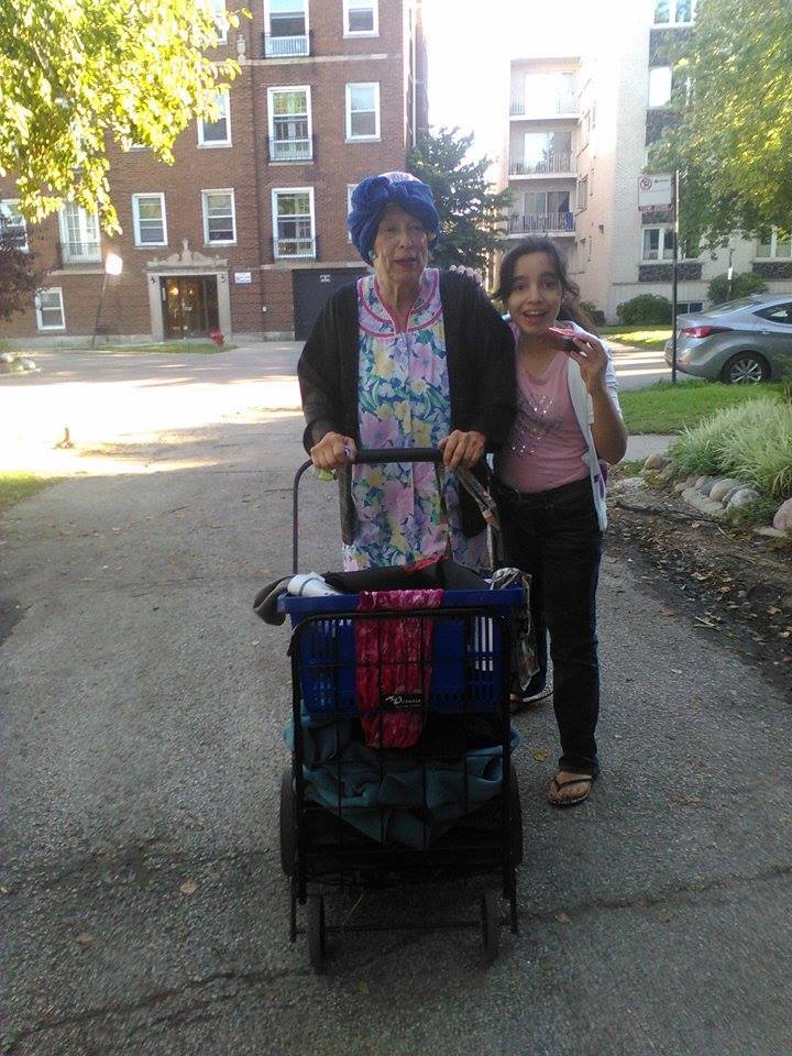 I decided to disguise myself as a bag lady - and I went all out! I put curlers in my hair and covered them with a big scarf. I wore a floral cotton housecoat under which was a pair of pink, calf length sweats - the better to see the falling down nylons around my ankles and the old shoes on my feet. I pushed a shopping cart full of clothes and supplies - including half a roll of toilet paper right on the top!
