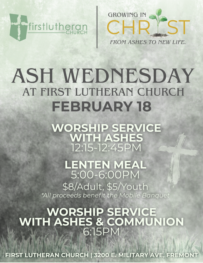 Experience Ash Wednesday at First Lutheran Church! Wednesday February 18 We invited you to join us for a brief afternoon worship with imposition of ashes from 12:15-12:45pm. If the afternoon doesn't work, you may also join us at 6:15pm for worship with imposition of ashes and Holy Communion. A Lenten Meal will also be served from 5:00-6:00pm. $8/Adult, $5/Child. ALL proceeds go to our Mobile Banquet Ministry to create meals for our community!