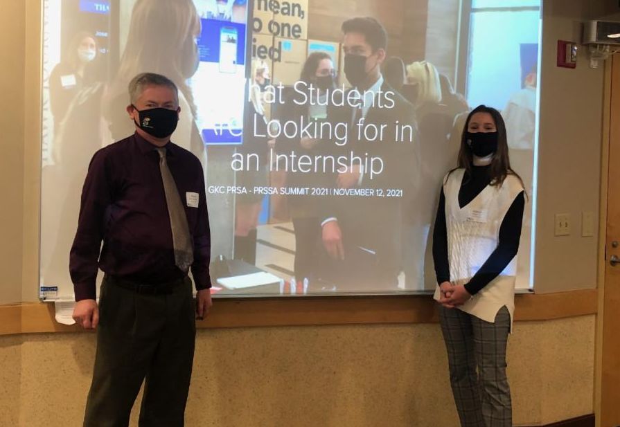 Steve Rottinghaus, career and outreach coordinator, and senior Kayleigh Helm were co-presenters at the Greater Kansas City-Public Relations Society of America’s Go Places with PR! Student Summit on Friday, Nov. 12, at Rockhurst University. Their presentation was titled “What Students Are Looking for in Internships.”