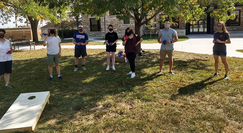 Students from the 8 a.m. section of JOUR 104 enjoyed a game of cornhole on Saturday afternoon in front of Stauffer-Flint Hall.
