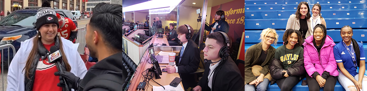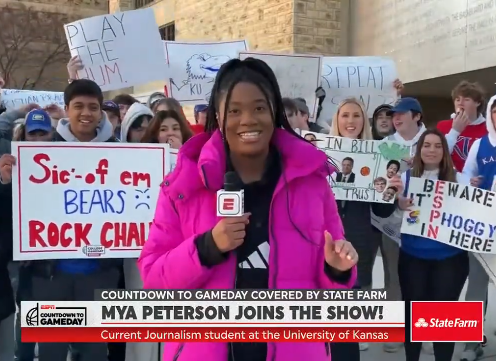 Last week was a full week of sports media opportunities for J-School students. Mya Peterson (above) was featured live on a College GameDay segment on Saturday. Watch here (starting at 12-minute mark). Students also covered (photos below) the Kansas City Chiefs' Super Bowl victory parade and celebration on Wednesday, the KU vs. Missouri ice hockey game (Rivalry at the Rink) on Thursday, and the KU vs. Baylor men's basketball game on Saturday. They also covered the KU women's basketball game Sunday and the baseball team in Texas.