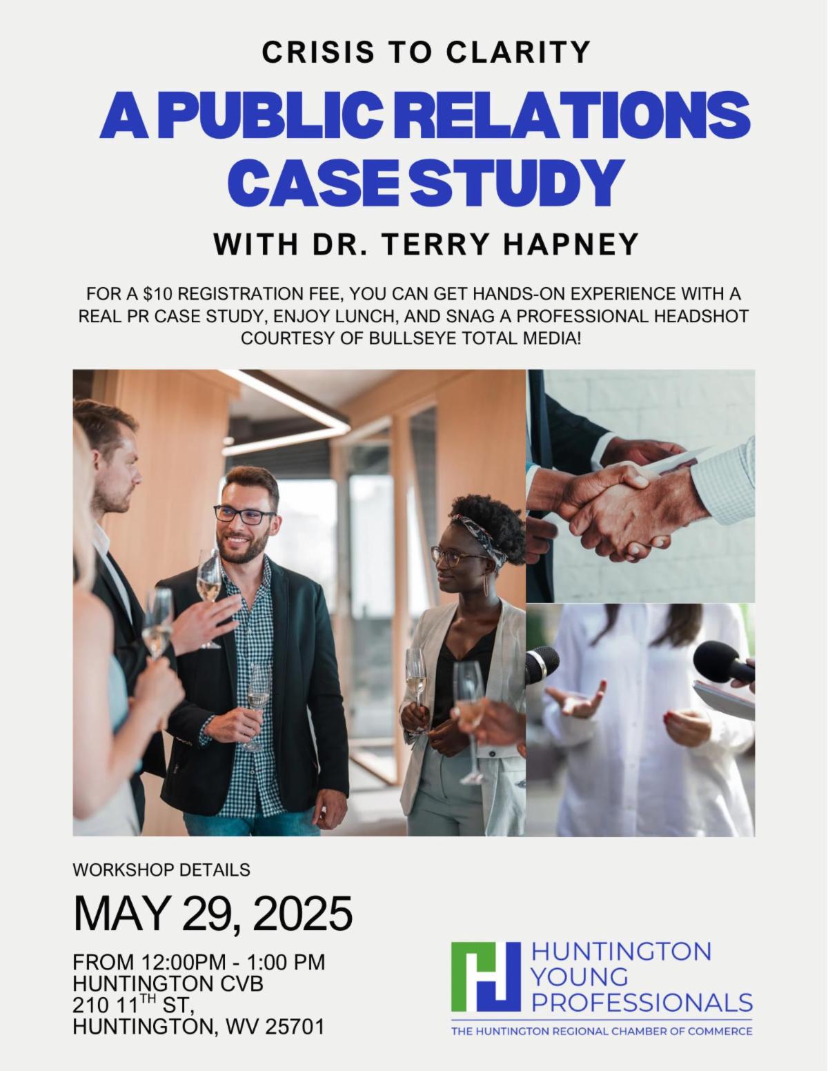| | Local Leaders Reflect on Legislative Session | | Last week, local leaders gathered for a Legislative Wrap-Up to discuss key outcomes from the recent session and what they mean for our business community. Thank you to Delegates Sean Hornbuckle and Daniel Linville for sharing their time and insights with our members, and to Dinsmore & Shohl for generously sponsoring the event! | | Did You Attend Our Annual Dinner? Take This Quick Survey! | | Our upcoming Lunch & Learn has reached full capacity—thank you to everyone who registered! If you’re no longer able to attend, please let us know as soon as possible so we can open your spot to someone on the waitlist. We’re looking forward to a great session! | | Next Nonprofit Roundtable: May 27 | | The next Nonprofit Roundtable will meet on Tuesday, May 27 at Mountwest Community & Technical College in room G07A from 10-11:30 a.m. All area nonprofit organizations are welcome to attend. Downtown Huntington Partners will be the featured organization. Derek Chapman from iHeart Media will talk about PSA's and in-kind sponsorship opportunities that they provide in addition to their paid media opportunities. | | HYP Lunch with Dr. Terry Hapney | | Join us for Crisis to Clarity: A Public Relations Case Study, presented by Dr. Terry Hapney and featuring the real-life case "Fatality and Facebook: A Perilous Combination" from his book. This interactive session will give attendees the opportunity to work in small groups to develop crisis communication strategies, present their plans, and respond to questions from a mock media panel. Afterward, you'll learn how the actual crisis unfolded and the lessons it offered. Plus, attendees can receive a free professional headshot, courtesy of Bullseye Total Media. | | Save the Date for Meet-Up 64 - June 18, 2025 | |