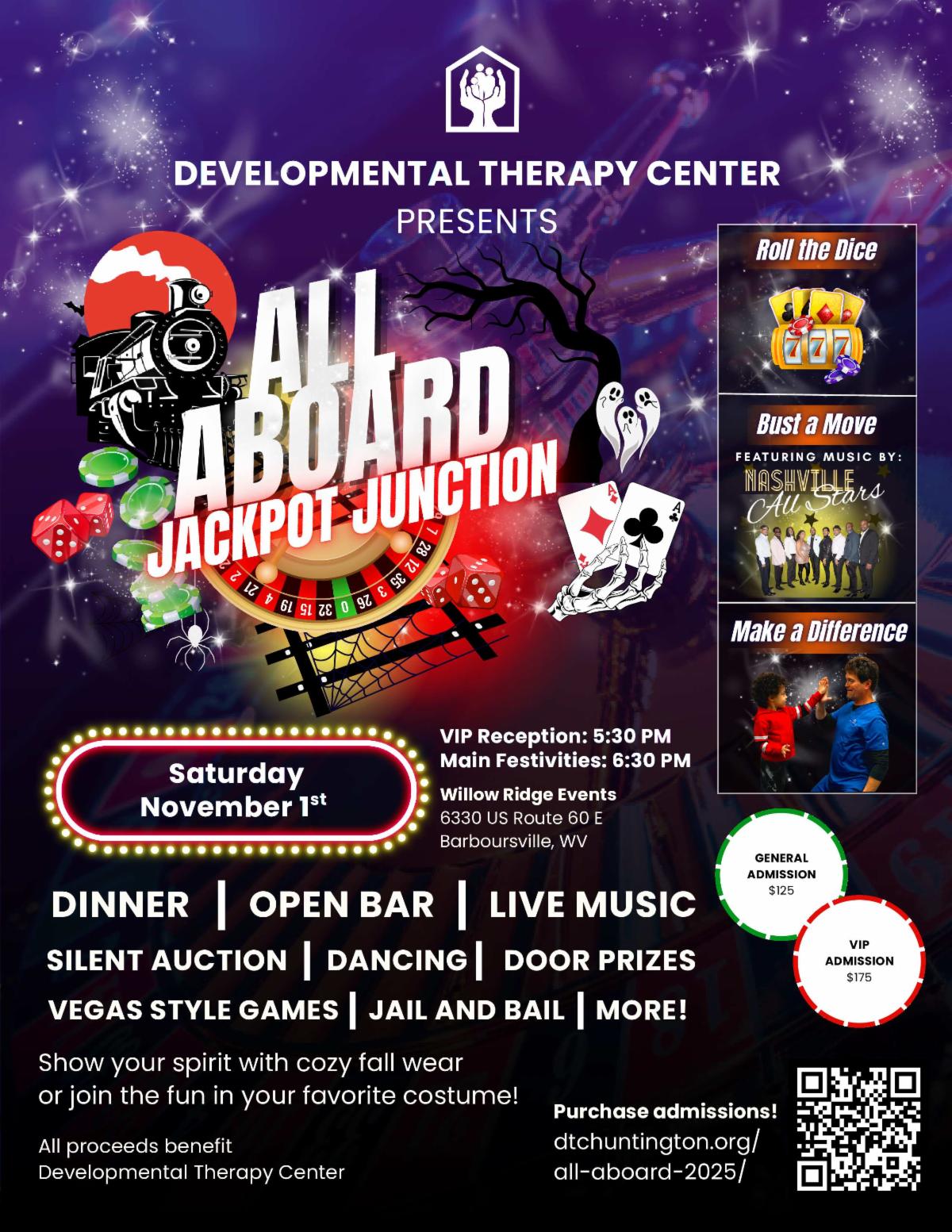From blackjack-style fun and festive sips to Halloween touches and live music by the 9-piece Nashville All Stars, All Aboard: Jackpot Junction delivers a high-energy evening on Saturday, November 1 at Willow Ridge Events. Enjoy themed food and drinks, seasonal décor, and a community celebration that fuels Developmental Therapy Center’s occupational, physical, and speech-language therapy for families across the Tri-State.