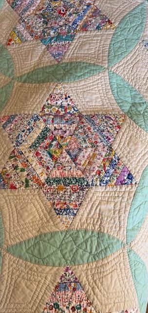 Handmade in 1940, this beautiful Star Chain variation bed quilt measures 78" x 84: and features a charming mint green, beige, and multicolor design. Crafted from cotton sacking fabric, it is hand quilted and hand finished. The quilt is in mint condition with no color loss and comes with a documented appraisal valued at $950—a rare and timeless treasure.